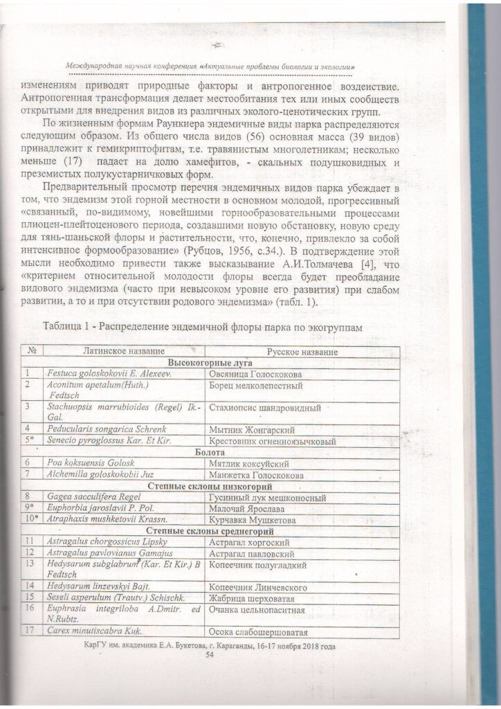Эколого-ценотический анализ эндемичных видов флоры Жонгар-Алатауского ГНПП (2018 г.)