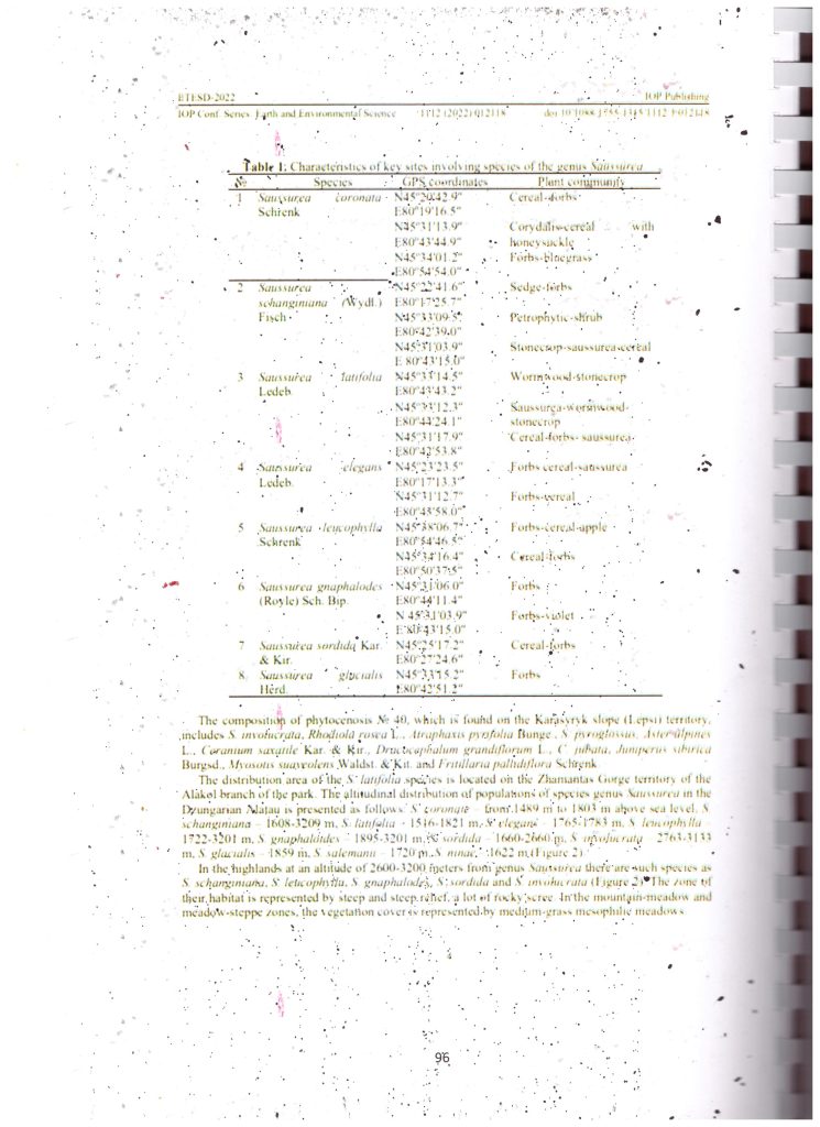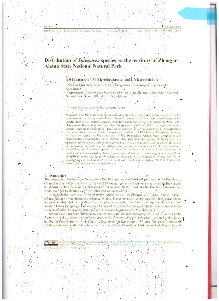 Распространение вида Saussurea на территории Жонгар - Алатауского государственного национального природного парка (2022 г.)